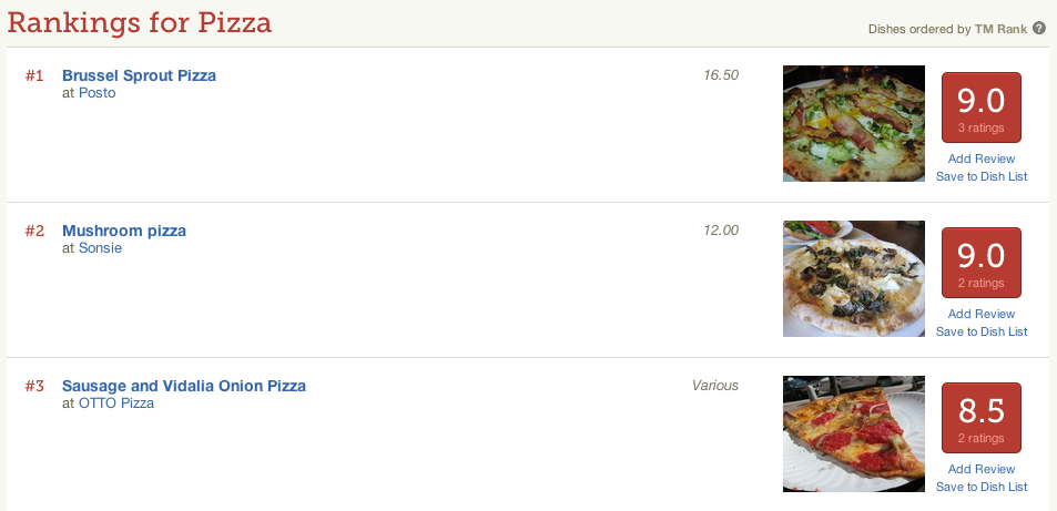 Let's say, for example, that I want to find the best pizza in Boston. Currently, the top three pizzas are Brussel Sprout Pizza at Posto, Mushroom Pizza in Sonsie, and Sausage and Vidalia Onion Pizza at OTTO. (Disagree? Sign up for an account and start adding your own rankings!)